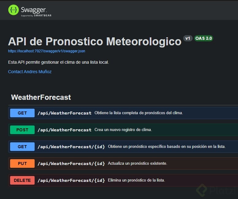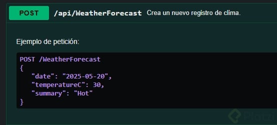 - Con esto, verás en Swagger UI descripciones como “Return all weather forecasts” y detalles de parámetros (por ejemplo, que “id” representa una “position”).