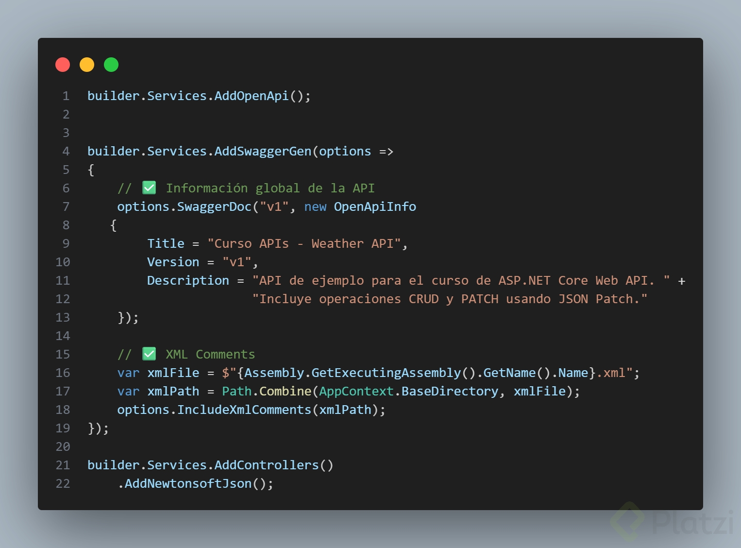 <!-- En .csproj --><ProjectSdk="Microsoft.NET.Sdk.Web"><PropertyGroup><!-- configuración para generar el archivo de documentación XML --></PropertyGroup></Project>