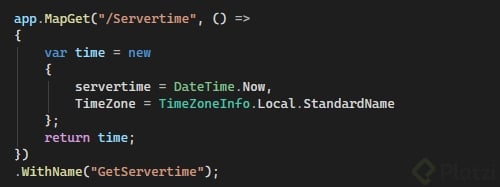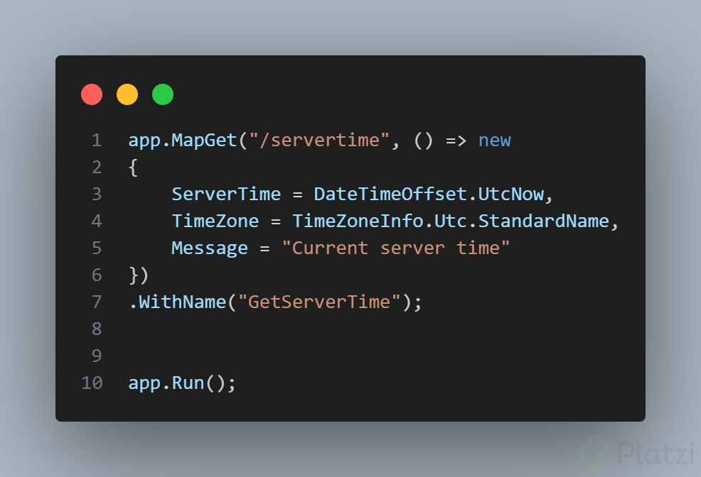var builder = WebApplication.CreateBuilder(args); var app = builder.Build(); // GET simple. app.MapGet("/weatherforecast", () => { var datos = new[] { "Soleado", "Nublado", "Lluvioso" }; var rng = new Random(); return Enumerable.Range(1, 3).Select(_ => new { Fecha = DateTime.UtcNow.AddDays(rng.Next(1, 5)), Estado = datos[rng.Next(datos.Length)] }); }); // Reto sugerido: devolver la hora del servidor. app.MapGet("/hora", () => DateTime.UtcNow); // Otras acciones típicas. app.MapPost("/recurso", () => Results.Created("/recurso/1", new { ok = true })); app.MapDelete("/recurso/{id}", (int id) => Results.NoContent()); app.Run();