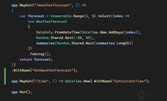 [ApiController] [Route("[controller]")] public class WeatherForecastController : ControllerBase { [HttpGet] public IEnumerable<object> Get() { // Datos de prueba y respuesta simulada. var datos = new[] { "Soleado", "Nublado", "Lluvioso" }; var rng = new Random(); return Enumerable.Range(1, 5).Select(_ => new { Fecha = DateTime.UtcNow.AddDays(rng.Next(1, 7)), Estado = datos[rng.Next(datos.Length)] }); } }