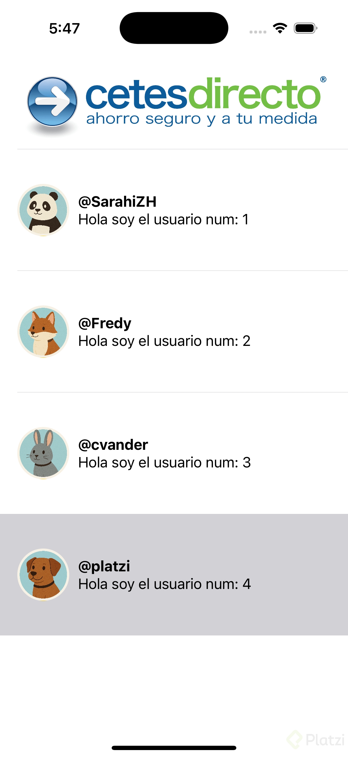 - Define una fuente de datos (data source) como un arreglo de strings que represente los nombres de usuarios o cualquier otro dato que quieras mostrar en la celda.
