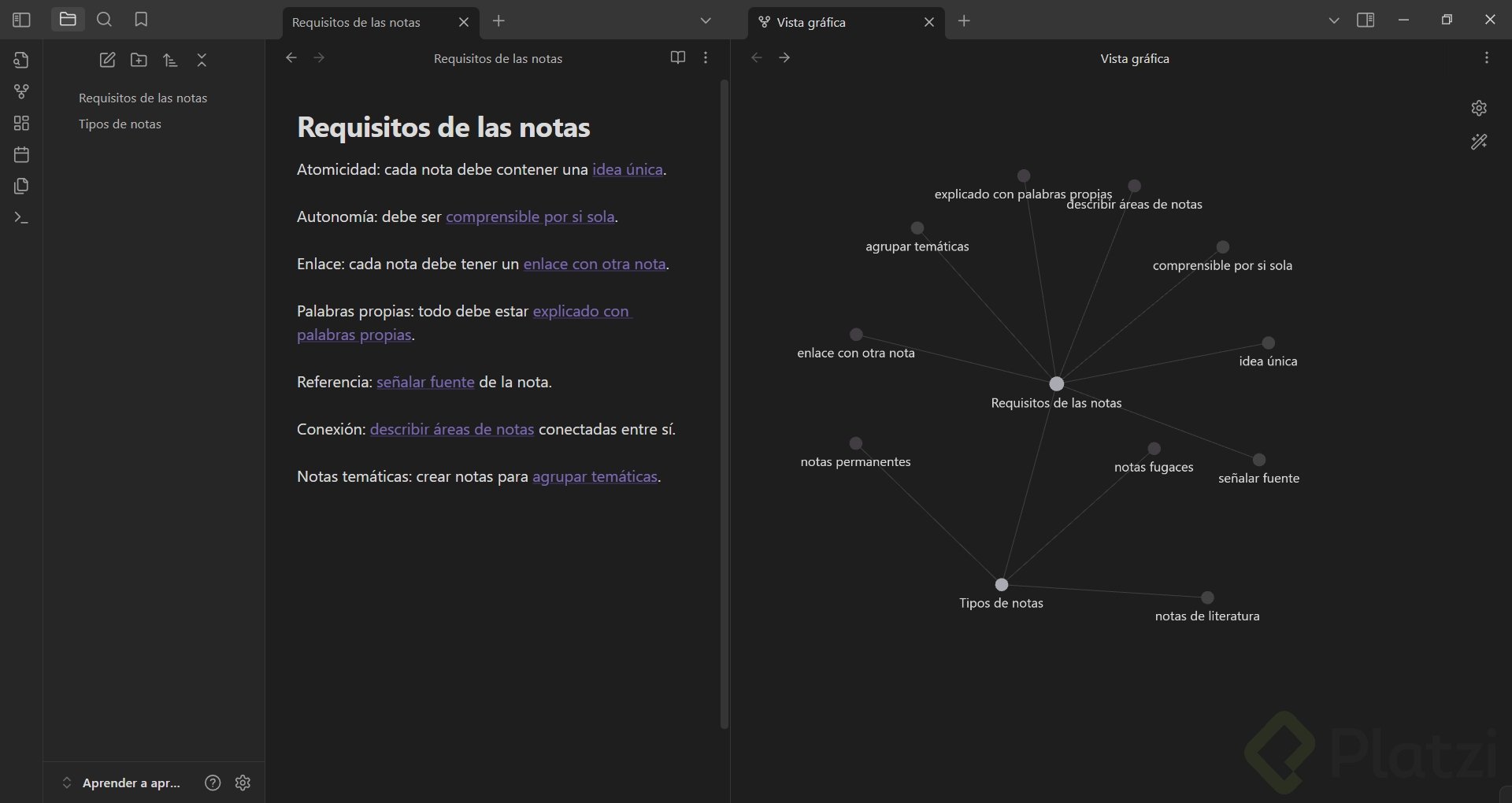 - Recuerda que puedes enlazar tus notas utilizando corchetes dobles [[]] al mencionar temas relacionados. Esto te permitirá navegar fácilmente entre las ideas y crear conexiones significativas.