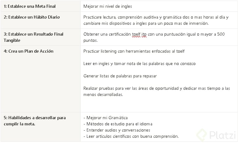 Por ejemplo, si tu meta es mejorar tu nivel de inglés para obtener una certificación, deberías: