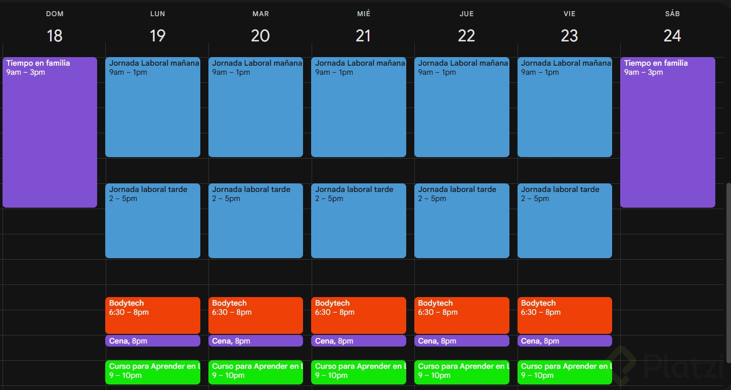 - El calendario estructura tu tiempo: planifica tus días incorporando horarios fijos y flexibles.