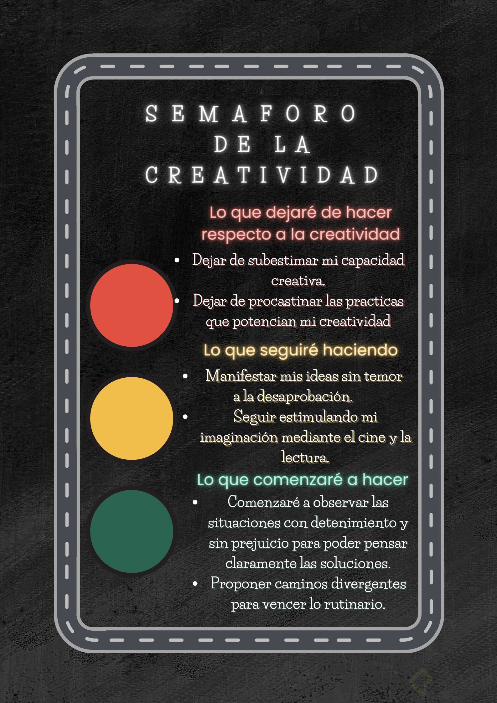 Luz Amarilla: Considera lo que has estado haciendo. ¿Qué hábitos, patrones o estrategias actuales despiertan tu creatividad? Identifica y anota estos factores que están trabajando a tu favor.🟡