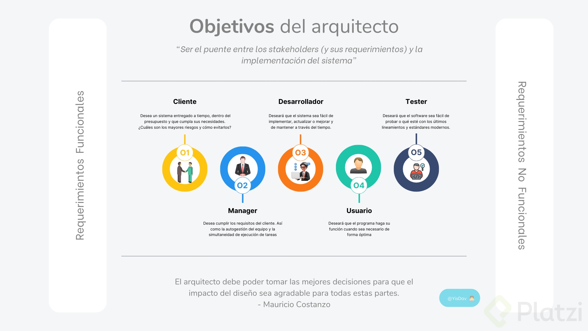 El arquitecto conecta los stakeholder con el sistema a construir. Cada uno de los roles que tienen los SH afectan de diferente forma el sistema.