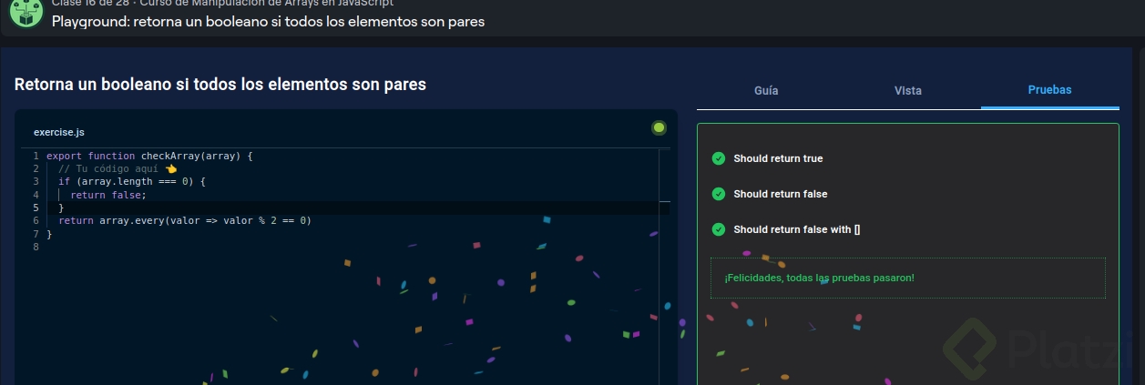 Completa el desafío con los conocimientos adquiridos e implementa el método every() en tu solución.