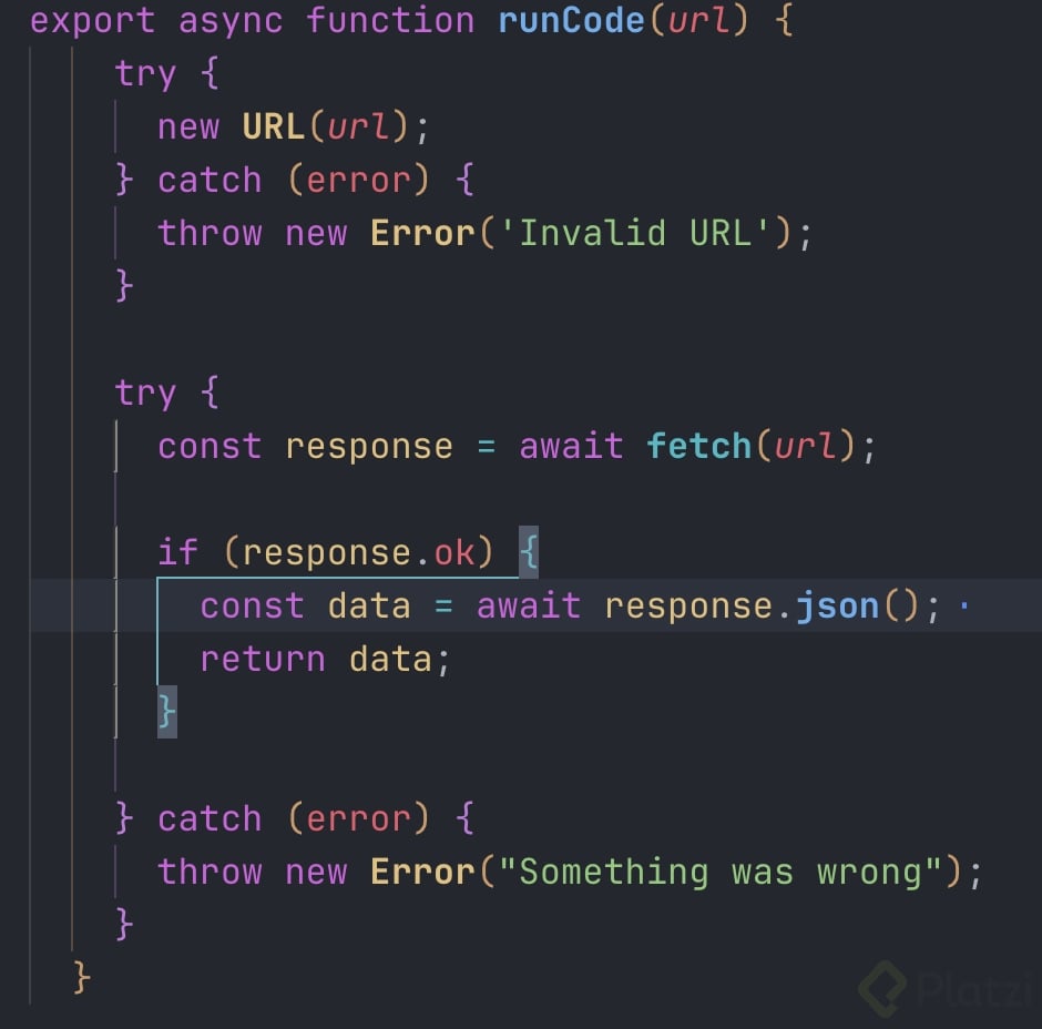 export async function runCode(url) { try { // validar formato correcto url new URL(url); } catch (e) { throw new Error('Invalid URL'); } try { // validar que exista url const response = await fetch(url) return response.json(); } catch (e) { throw new Error('Something was wrong'); } }