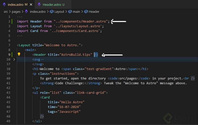 - Uso del componente en index.astro: Traemos los componentes creados dentro del archivo principal como se muestra a continuación.