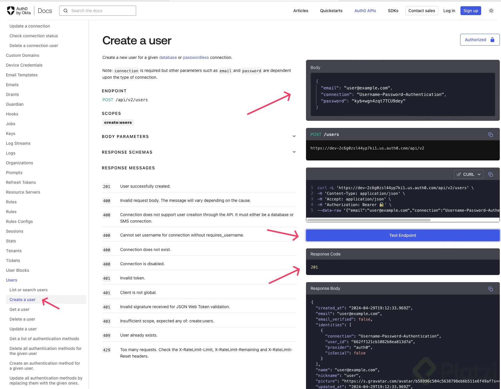Durante la creación de un usuario, pueden surgir problemas como no poder establecer un username si la conexión elegida solo admite autenticación por email. En tal caso, elimina el username del JSON y reintenta la operación. Si la respuesta es un 201, el usuario se ha creado con éxito.