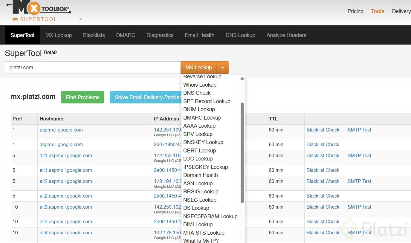 Esto nos muestra los servidores de correo que atienden el dominio especificado.
