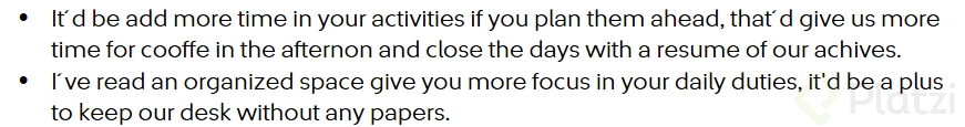 - "You could be more effective with your time if you organize your files" (Podrías ser más efectivo con tu tiempo si organizas tus archivos).