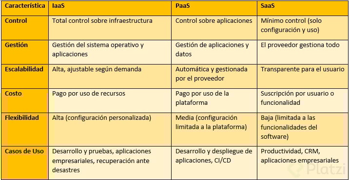 - Infraestructura como servicio: administras aplicaciones, datos, runtime, middleware y sistemas operativos; el proveedor gestiona virtualización, servidores, almacenamiento y redes.
