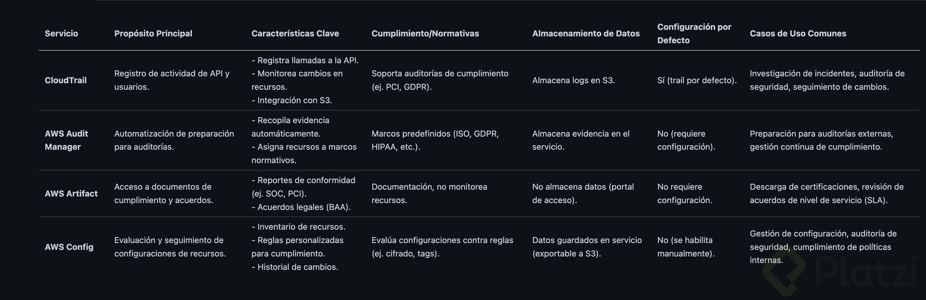 AWS proporciona un conjunto de herramientas diseñadas para ayudarte a monitorear y auditar tus recursos, asegurando que cumplan con las normativas y estándares de seguridad. Estas herramientas incluyen CloudTrail, AWS Audit Manager, Artifact y AWS Config.