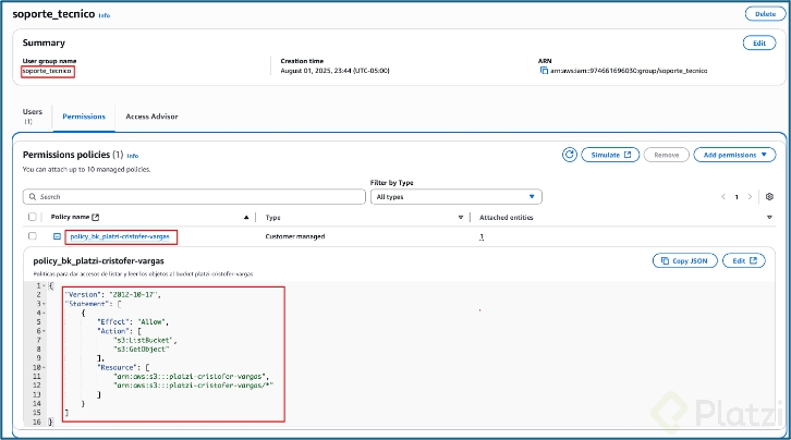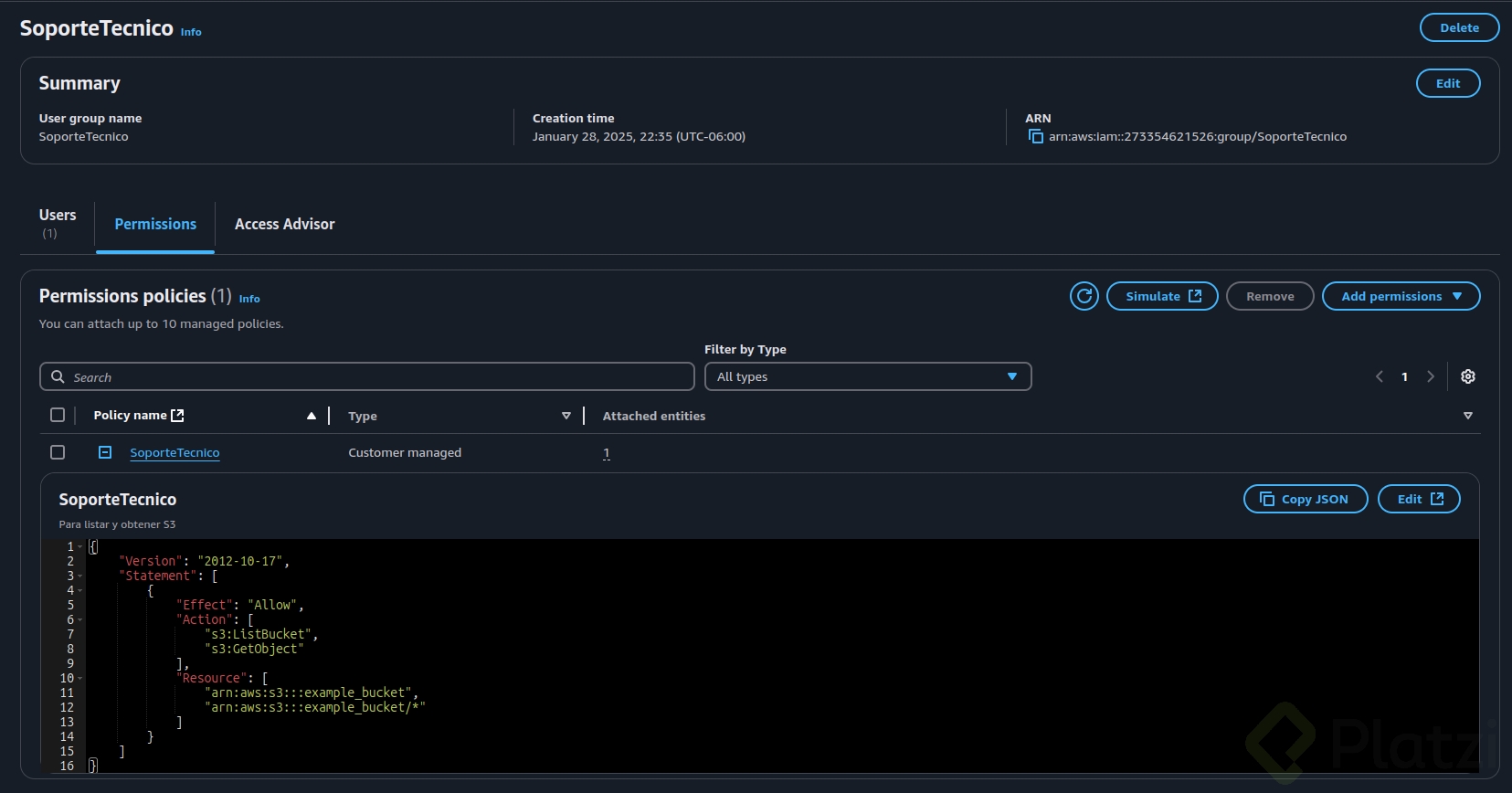 Un equipo de desarrollo necesita acceso de lectura y escritura a un bucket S3. Creas una política personalizada y la aplicas al grupo "Desarrolladores". Esto asegura que todos los miembros del grupo tengan los permisos necesarios.