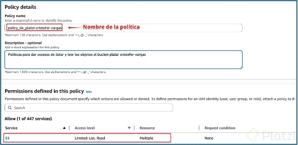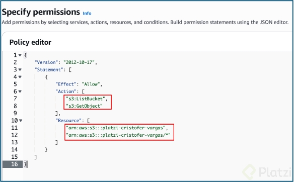 - Usa el editor JSON para definir permisos específicos (AWS también tiene la opción de editar estos permisos en una interfaz, por si los JSON se hacen complicados).