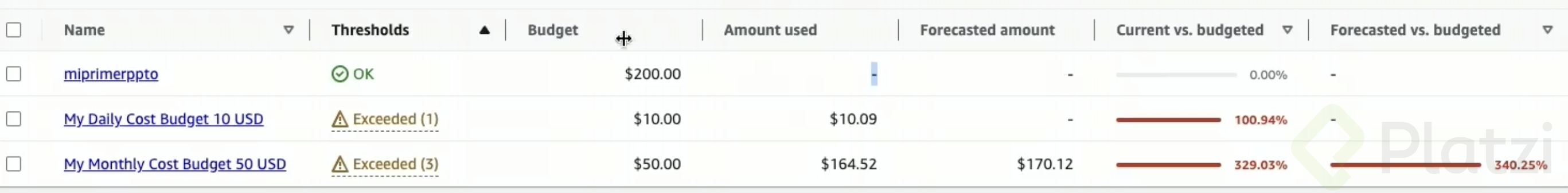 - Monthly Cost Budget: Monitorea el costo mensual.