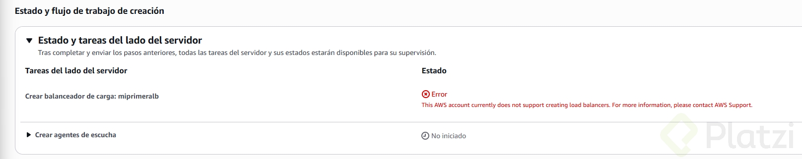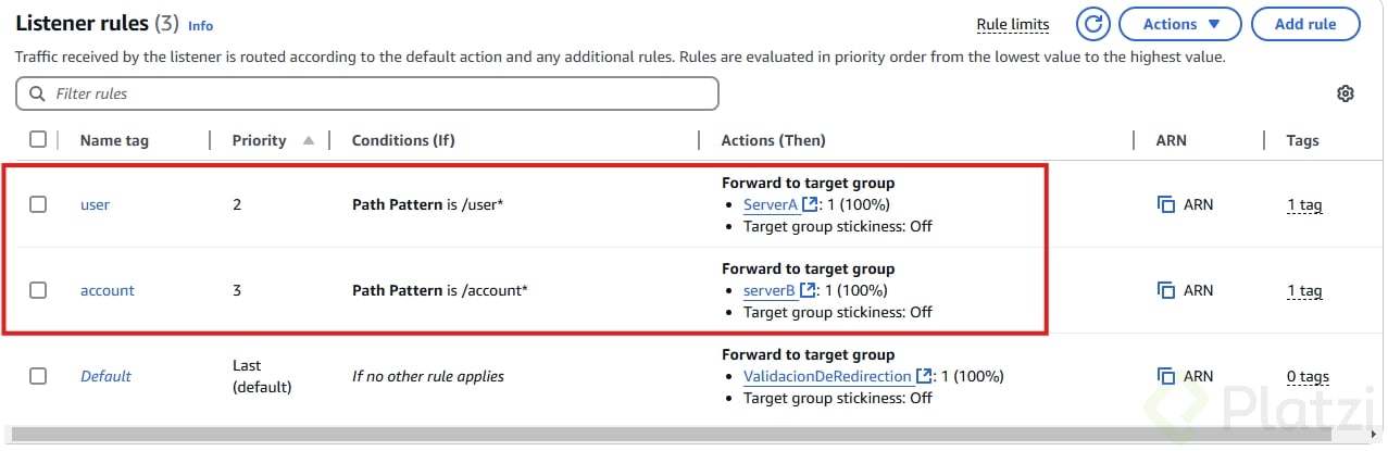 - Un "listener" es dónde el ALB 'escucha' tráfico entrante; configurar para que el ALB escuche por el puerto HTTP 80.
