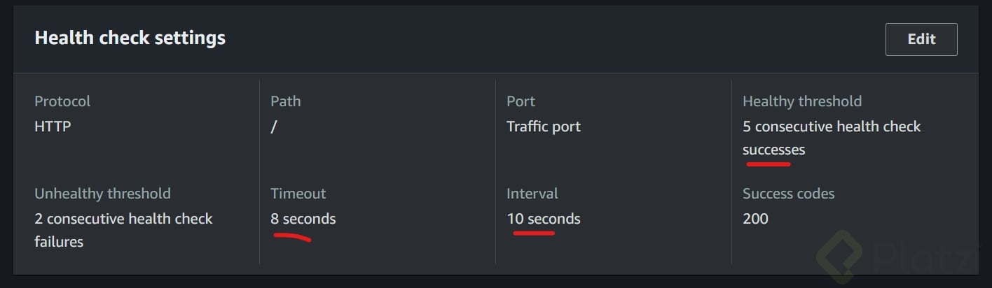 - Timeout: Tiempo que espera el balanceador antes de parar de enviar tráfico si la instancia no responde.