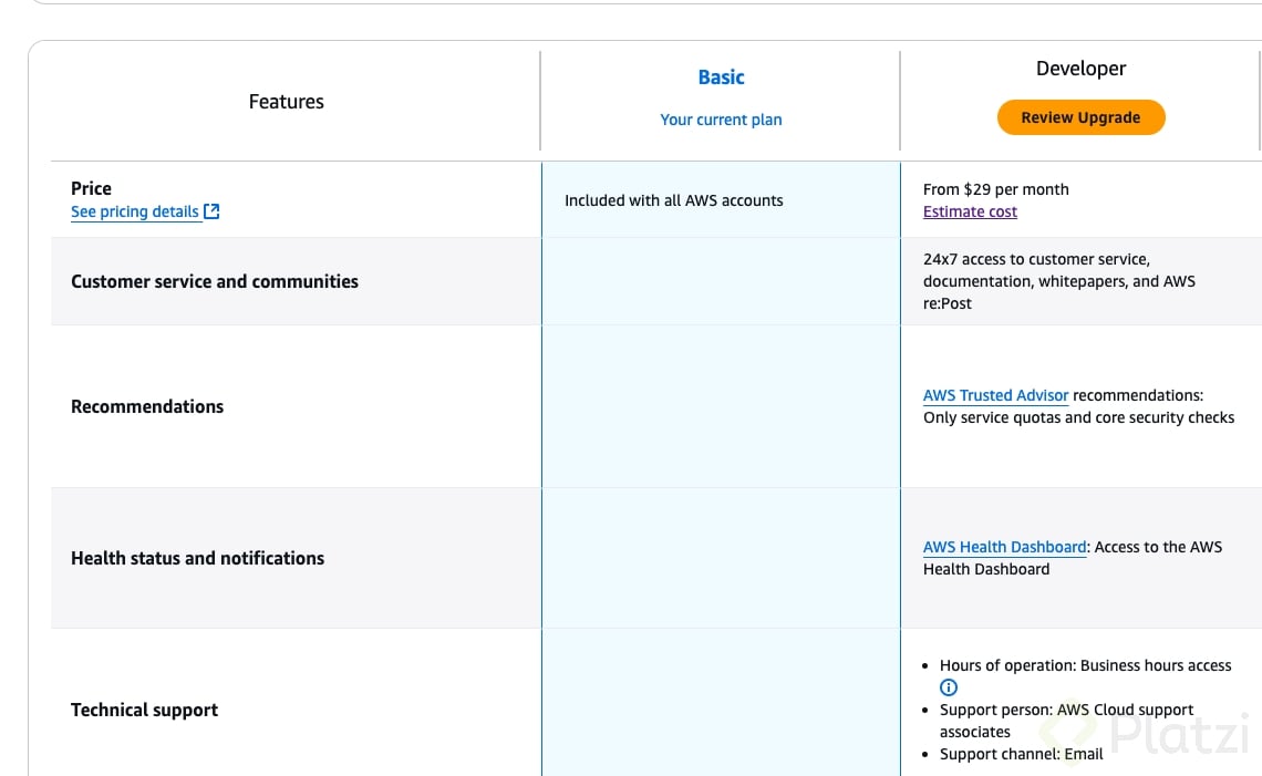Soporte Developer: Con un costo de $29 al mes, este plan incluye documentación, white papers, y acceso a un Trusted Advisor más completo. Aunque mejora ligeramente el soporte, cuenta con horas limitadas de respuesta a casos y una capacidad de contacto básica.