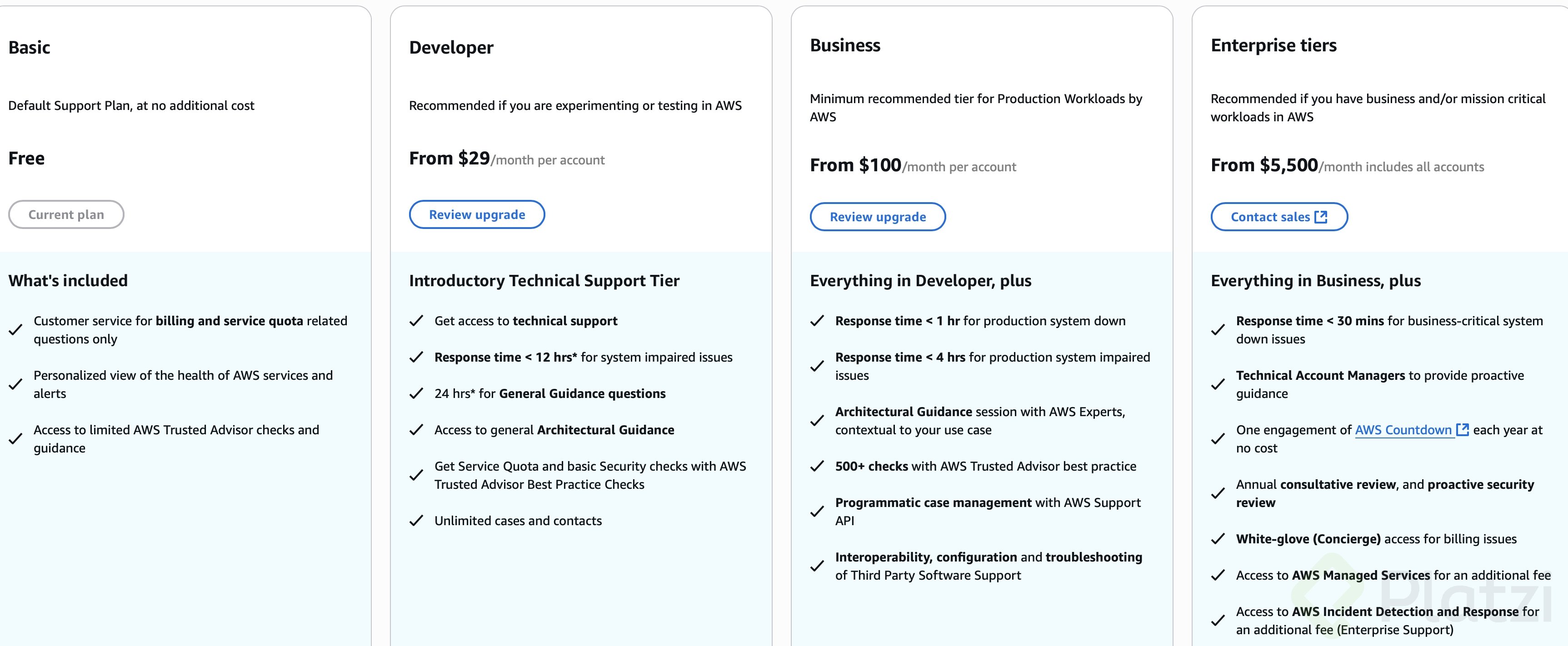 - Nivel de expertise interna: Si tu equipo de TI es limitado o no tiene experiencia en AWS, los planes Business o Enterprise aseguran un soporte más sólido y rápido.