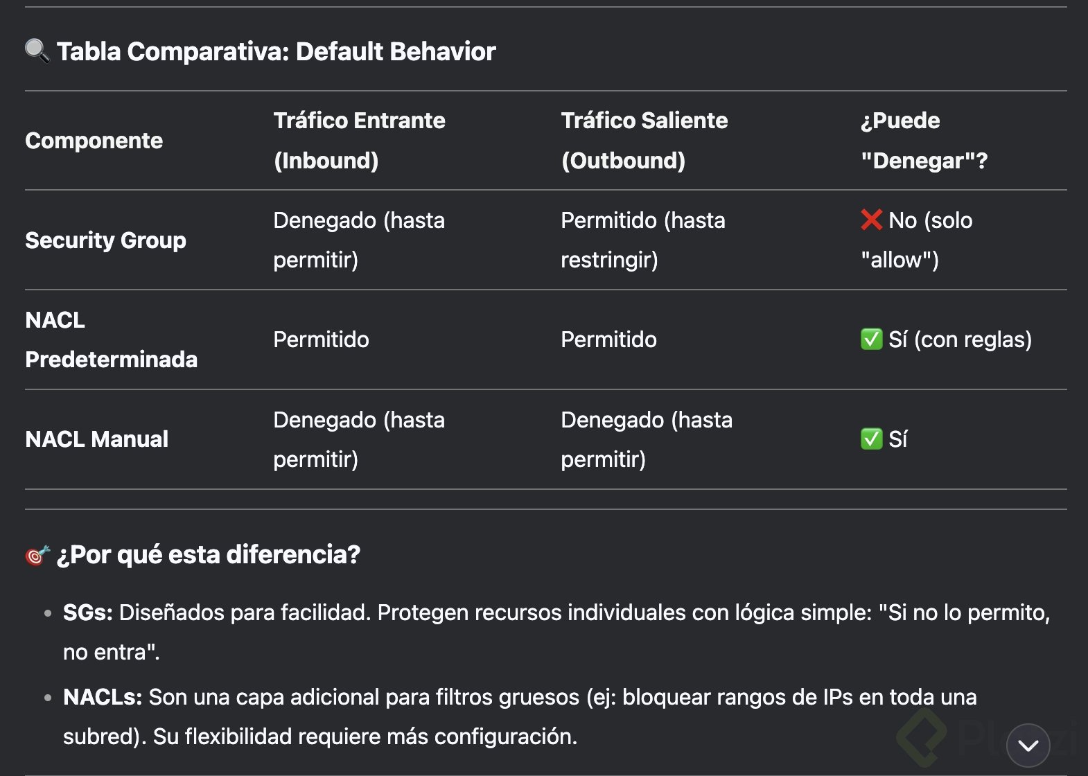- Reglas permitidas: Los Security Groups solo operan bajo reglas que permiten el tráfico.