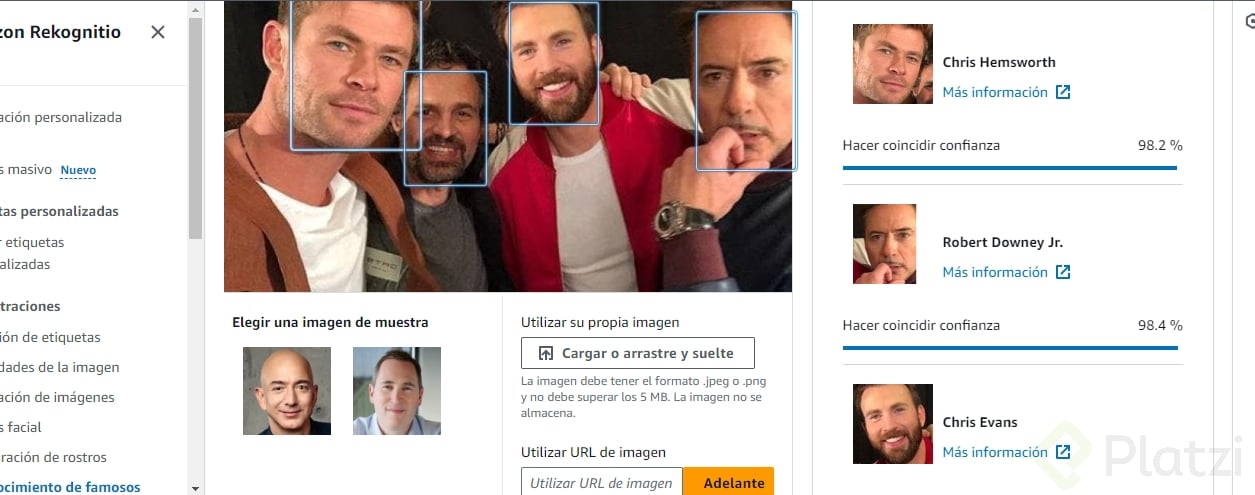 Como se puede apreciar, Rekognition reconoce a los tres actores con un porcentaje de confianza.