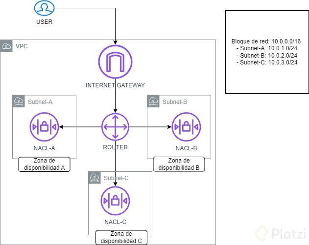 Este es el diagrama final. Muestra que cuando un usuario intenta acceder al VPC se encontrará con el Internet Gateway. Luego, el tráfico será dirigido al router, que se encargará de redirigirlo a una de las dos subnets las cuales contienen un Network Access Control List. Este se encargará de validar que el usuario pueda acceder al contenido.