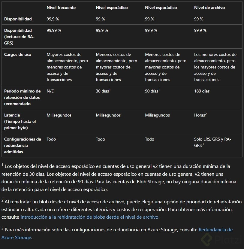 En Azure, el almacenamiento se categoriza en cuatro niveles diferentes, cada uno con sus propias características y usos: