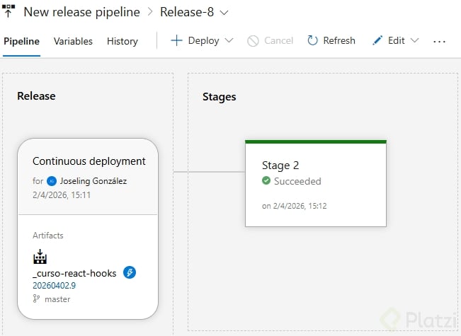 Este artefacto queda disponible para ser consumido por otros pipelines o, en particular, por la sección de releases [1:42]. Los releases permiten ver el historial completo de publicaciones: cuáles fueron satisfactorias, la fecha, el branch asociado y el estado de cada despliegue.