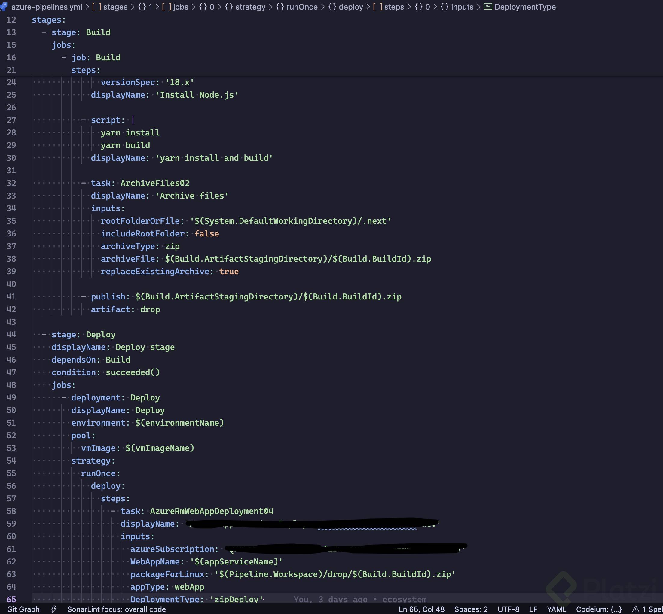 - Propiedades del YAML: Define el entorno de ejecución, los agentes utilizados (por ejemplo, un sistema operativo Ubuntu virtual) y las tareas a realizar, como la instalación de dependencias o ejecución de scripts.
