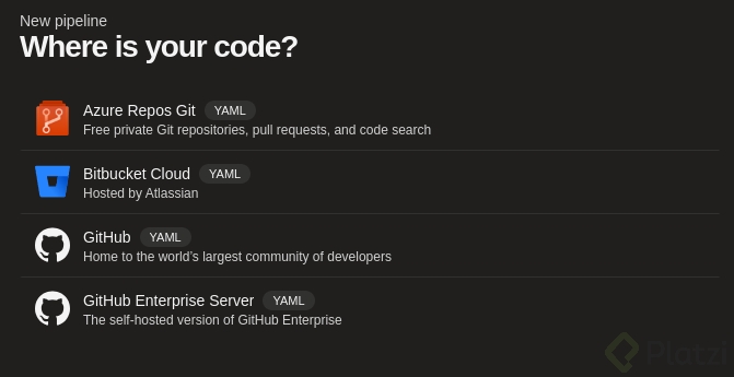 - Elegir crear un nuevo pipeline: Esta opción permite seleccionar diferentes repositorios, incluido Bitbucket Cloud o GitHub.