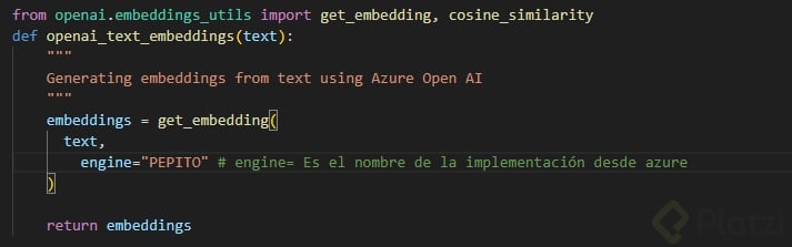 - Embeddings de textos: Una función recibe el texto para transformarlo en una representación vectorial. Este vector sirve como base para la búsqueda vectorial.