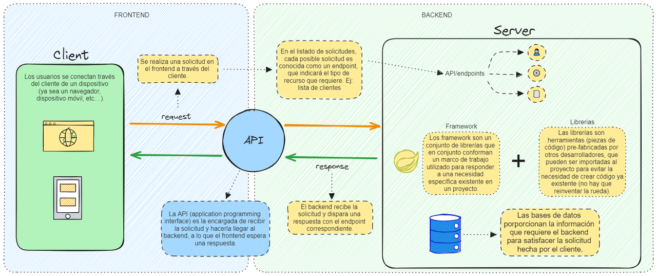 <aside> 💡 El frontend y backend trabajan en conjunto, y se valen de múltiples otras herramientas y tecnologías para responder a las solicitudes de los usuarios. </aside>