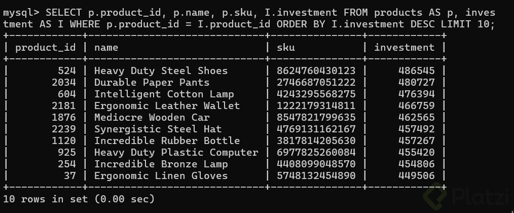 En este caso, se obtienen inversiones superiores a un valor específico desde la tabla "investment" y se combinan con nombres y precios desde la tabla "products".