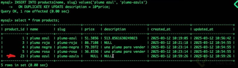 ON DUPLICATE KEY UPDATE description = 'actualizado por duplicidad';