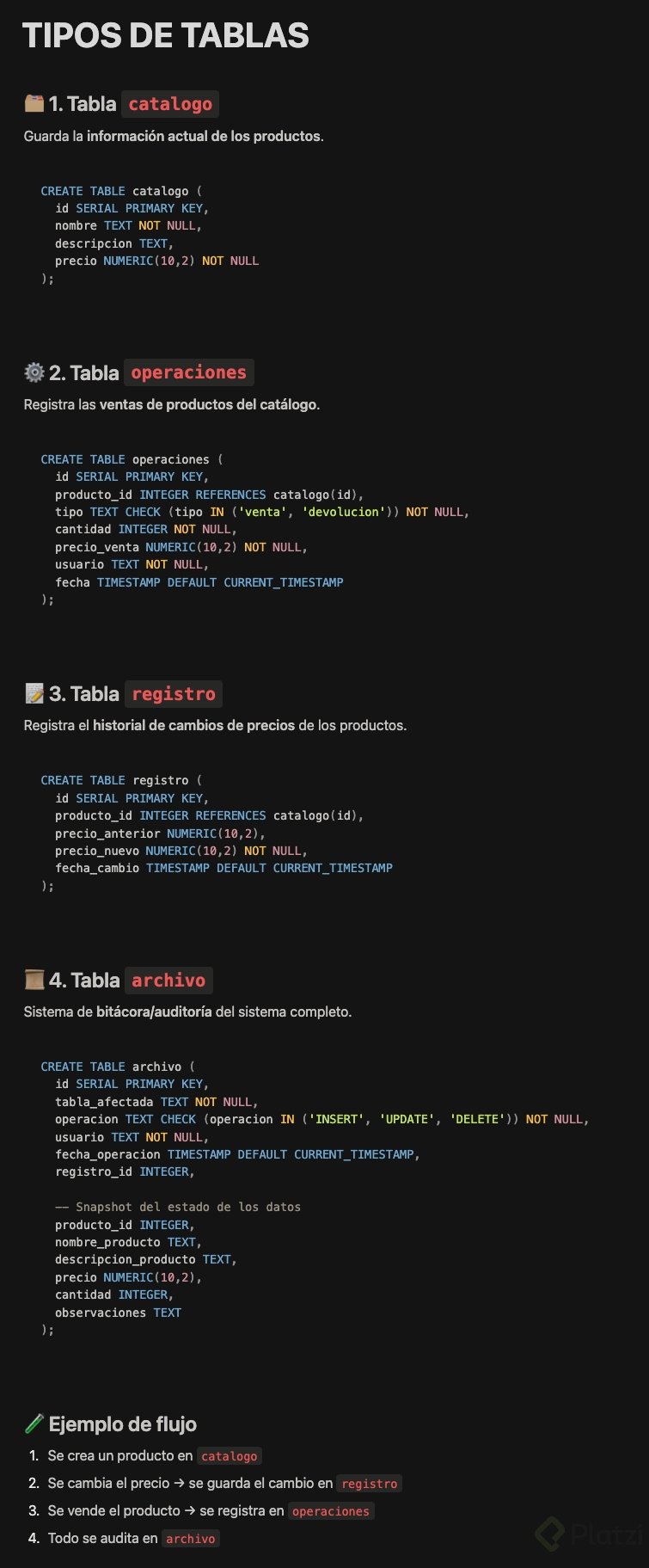 Una tabla catálogo contiene elementos permanentes sobre los cuales se realizan operaciones. Por ejemplo, en una tienda, esta tabla incluirá información fija sobre productos como nombre, precio, descripción e identificadores únicos. Típicamente: