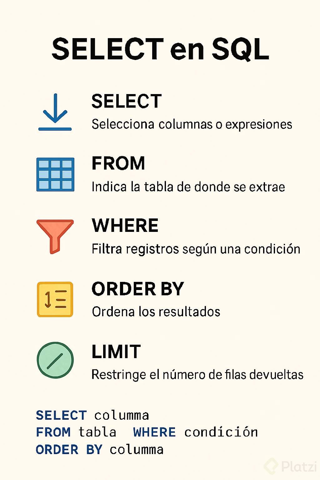 SELECT es la instrucción principal para consultar datos en SQL. Permite mostrar información desde tablas o sistemas. Su estructura básica requiere indicar qué columnas quieres consultar y desde qué tablas: