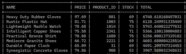 SELECT nombre, precio, stock, precio * stock AS total_inventario FROM productos;