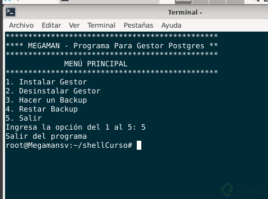 - Pulsa 5 para salir con exit 0 y cerrar todo el programa.