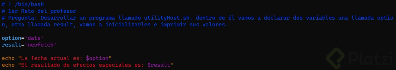 Desarrollar un programa llamado utilityHost.sh, dentro de él vamos a declarar dos variables una llamada option, otra llamada result, vamos a inicializarles e imprimir sus valores.