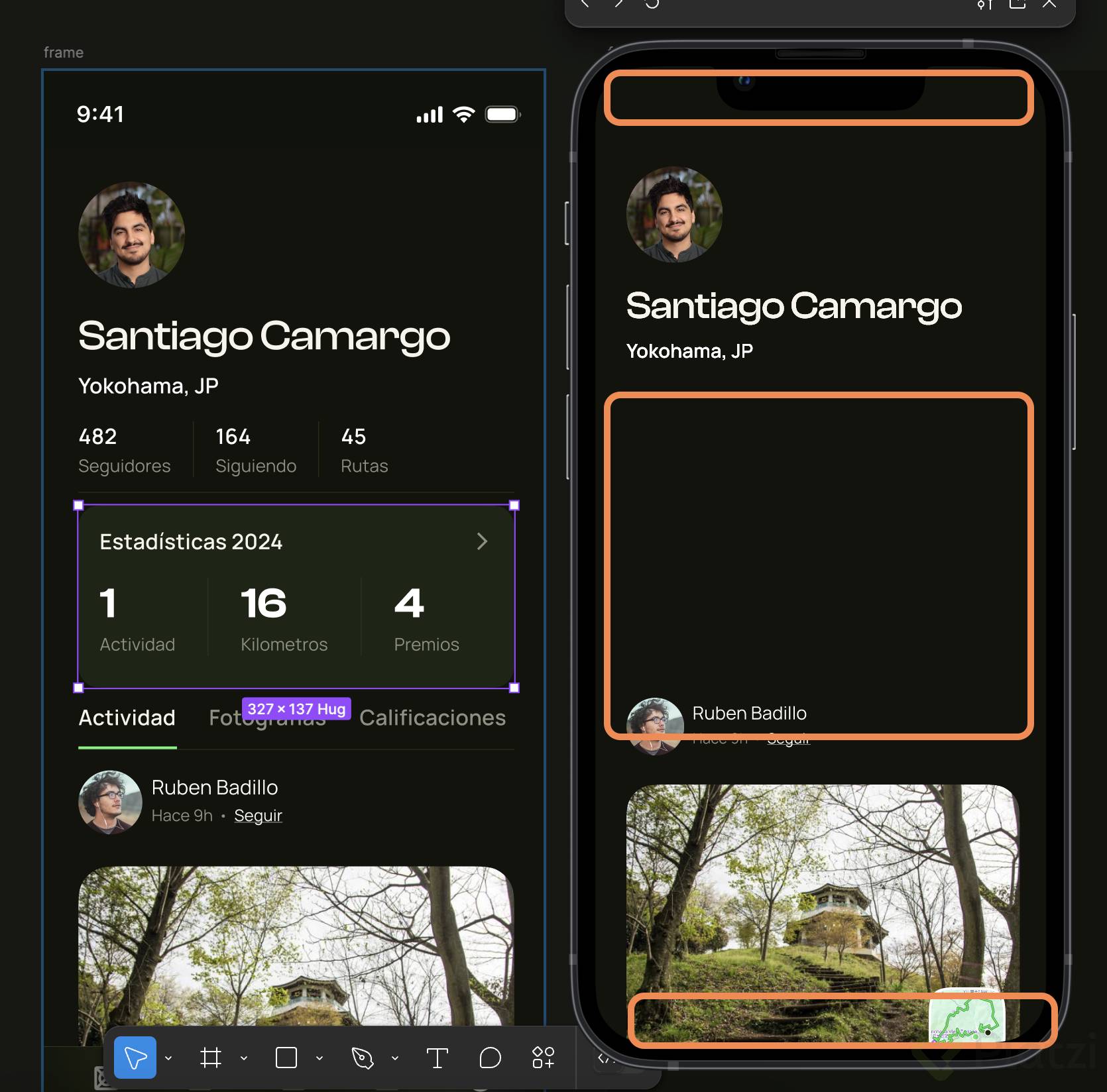 - Barra de estatus: Se comienza con la inserción de una barra de estatus para iPhone dentro de un frame con dimensiones de 375x812, ideal para diseñar para el iPhone 13 mini.