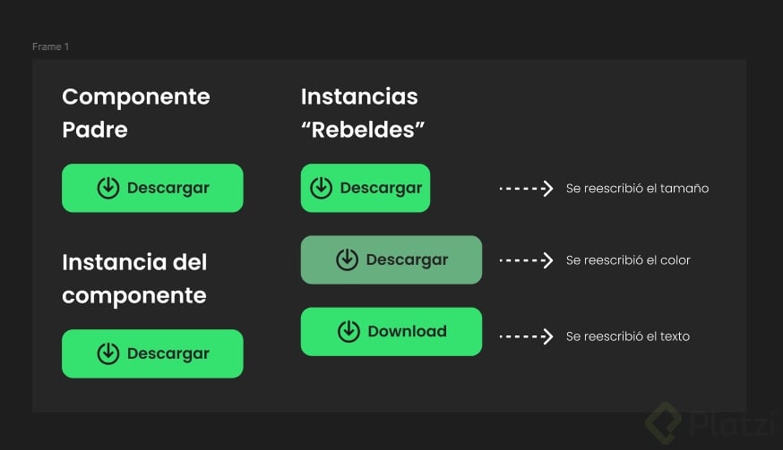 Instancias: Cuando copias o duplicas un componente maestro, las copias son instancias que heredan todos los cambios del maestro, excepto si algo ha sido sobrescrito.