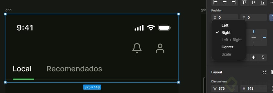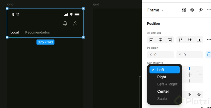 Constraints: Utiliza constraints dentro de un frame para definir el comportamiento de los elementos al modificar el tamaño del frame padre. Por ejemplo, puedes alinear ciertos elementos a la izquierda o a la derecha del frame, asegurando que se mantengan constantes las proporciones deseadas al escalar.