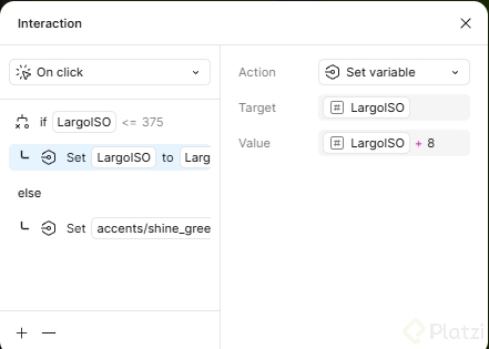 largoISOes menor o igual a 375, entonces realiza la acción de aumentar el valor delargoISOen 8.{ "type": "variable", "trigger": "ontap", "condition": "largoISO <= 375", "action": "set largoISO = largoISO + 8" }