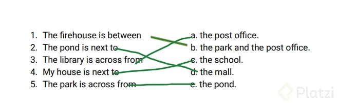 Ejemplo de ciudad: Imagina un mapa con un estanque, un centro comercial y una biblioteca. Podrías decir que el centro comercial está entre el estanque y la biblioteca.