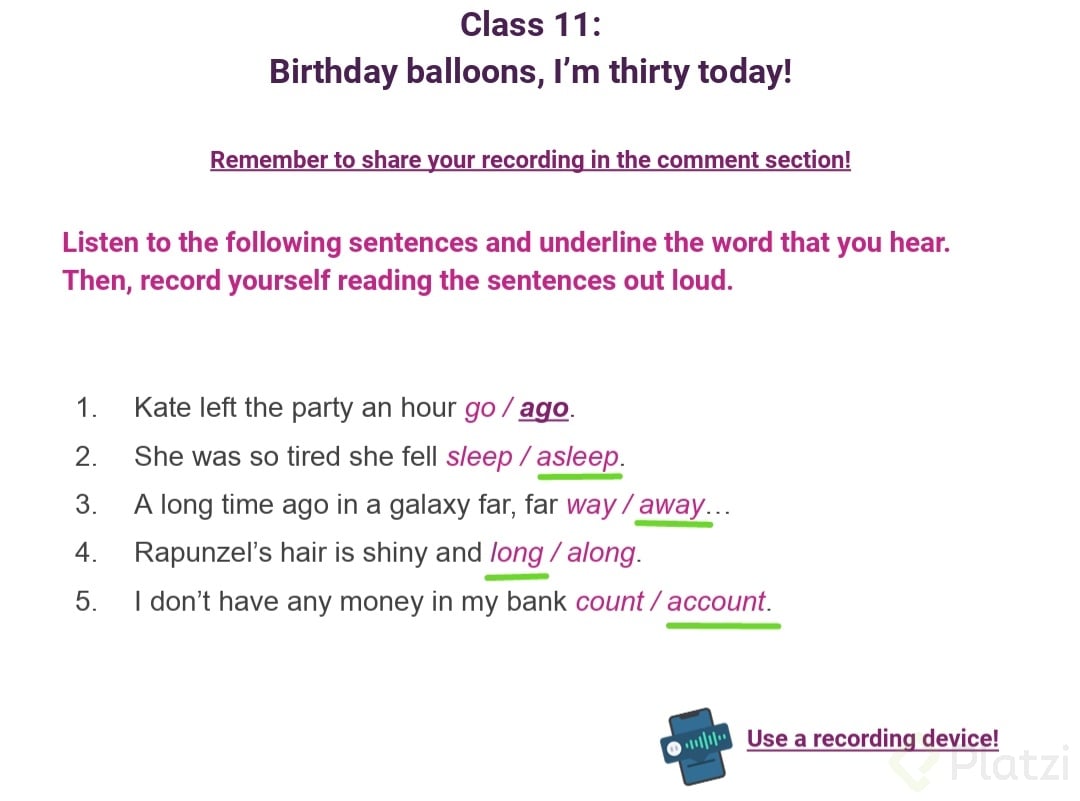 Grábate leyendo las frases en voz alta para mejorar tu pronunciación y chequea tu progreso. ¡Buena suerte y sigue practicando!