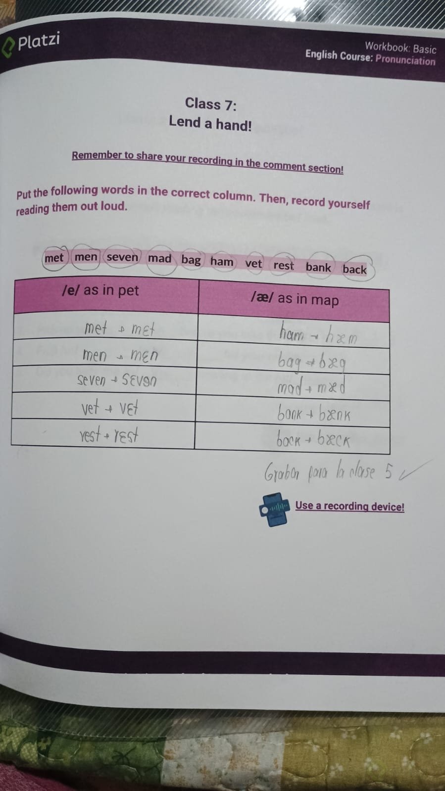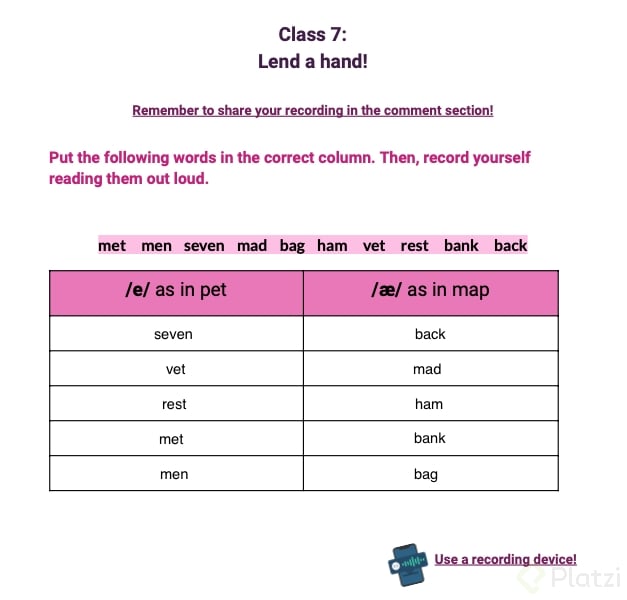Ahora te toca a ti. Practica y clasifica las palabras en tus grabaciones. ¿Tienen el sonido 'e' como en pet o 'a' como en map? Comparte tus grabaciones y avanza con tus ejercicios. ¡Buena suerte y sigue practicando para perfeccionar tu inglés!