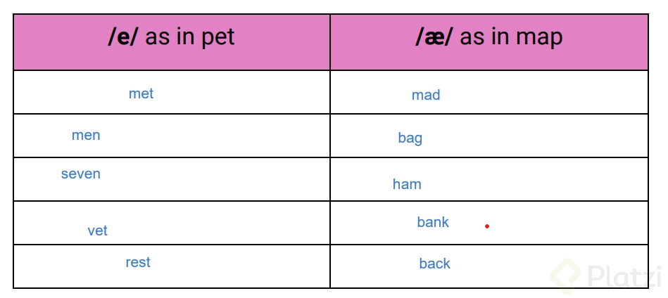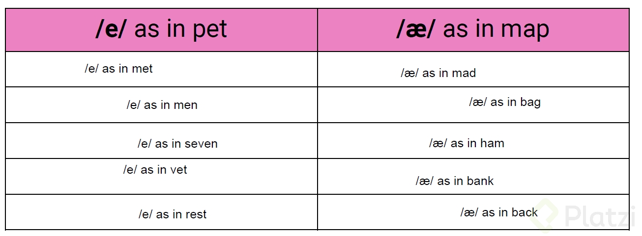 El sonido 'e', como en pat, es breve y tiene ciertos aspectos distintivos para tener en cuenta: