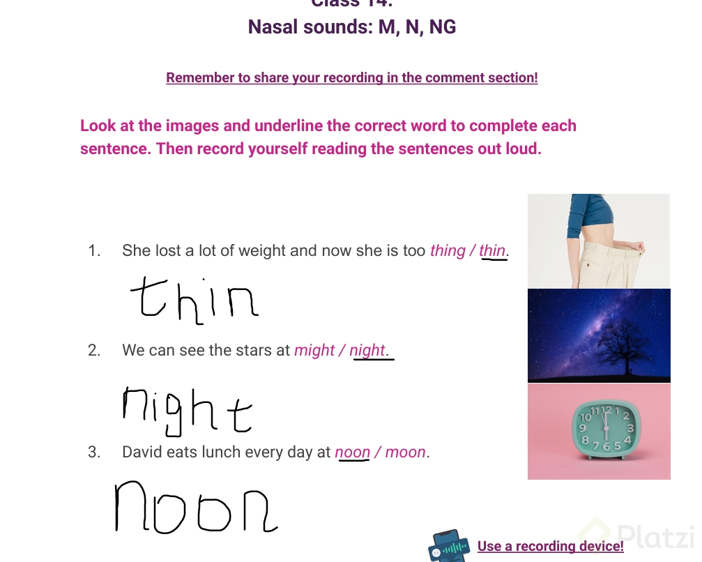 - Escucha y repite: Usa frases como "Nice to meet you" o "Do you like to sing?" para identificar y repetir los sonidos nasales.